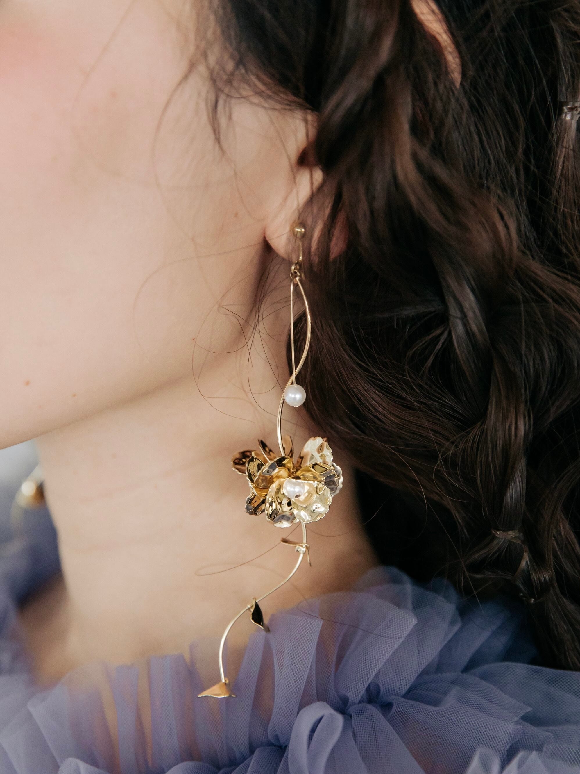 光沢感とフラワーモチーフが存在感を出しながらも大人の女性らしさを引き立てお耳元で上品に輝き特別な瞬間をより華やかにご演出いたします。